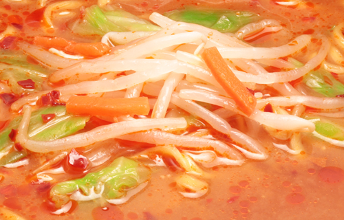 カップ麺の具材は乾燥具材が一般的ですが、当商品のもやしとニンジンはカップ麺では珍しい生タイプの調理済み具材です。だからもやしのシャキシャキ感とボリュームが一味違います!辛味噌スープと絡めながらご堪能ください。
