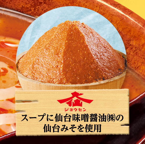 スープには、まろやかな旨みと香りが特長の「仙台味噌醤油株式会社」の仙台みそを100%使用しています。仙台みそを贅沢に使用することで、コク深く奥行きのある旨辛なスープに仕上げました。
